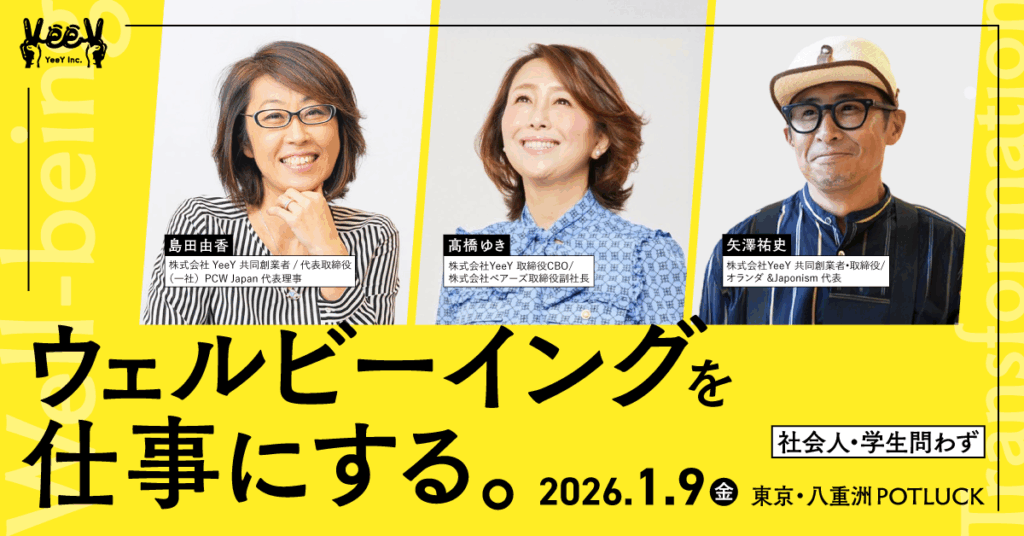 2026年1月9日(金)、東京・八重洲POTLUCKにて、株式会社YeeY 共同創業者/代表取締役の島田由香と、取締役の髙橋ゆき、矢澤祐史によるトークセッションを開催します。